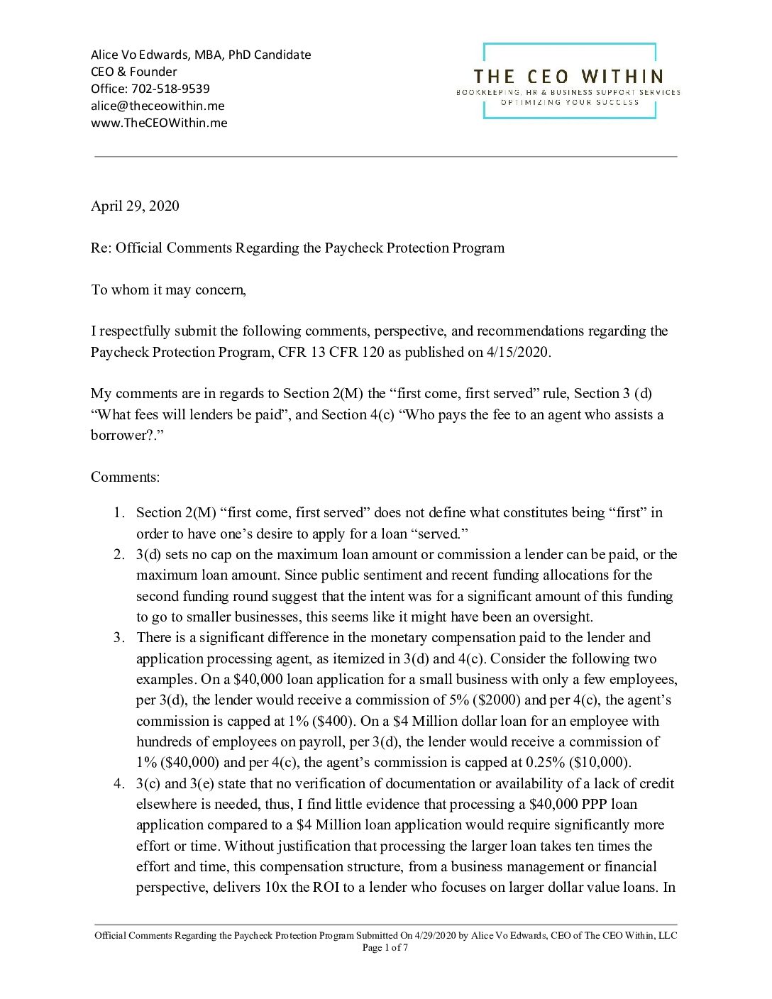 During the COVID-19 pandemic, I submitted a public comment to the Federal Register analyzing the Paycheck Protection Program’s adverse impact on small businesses. My comment included: